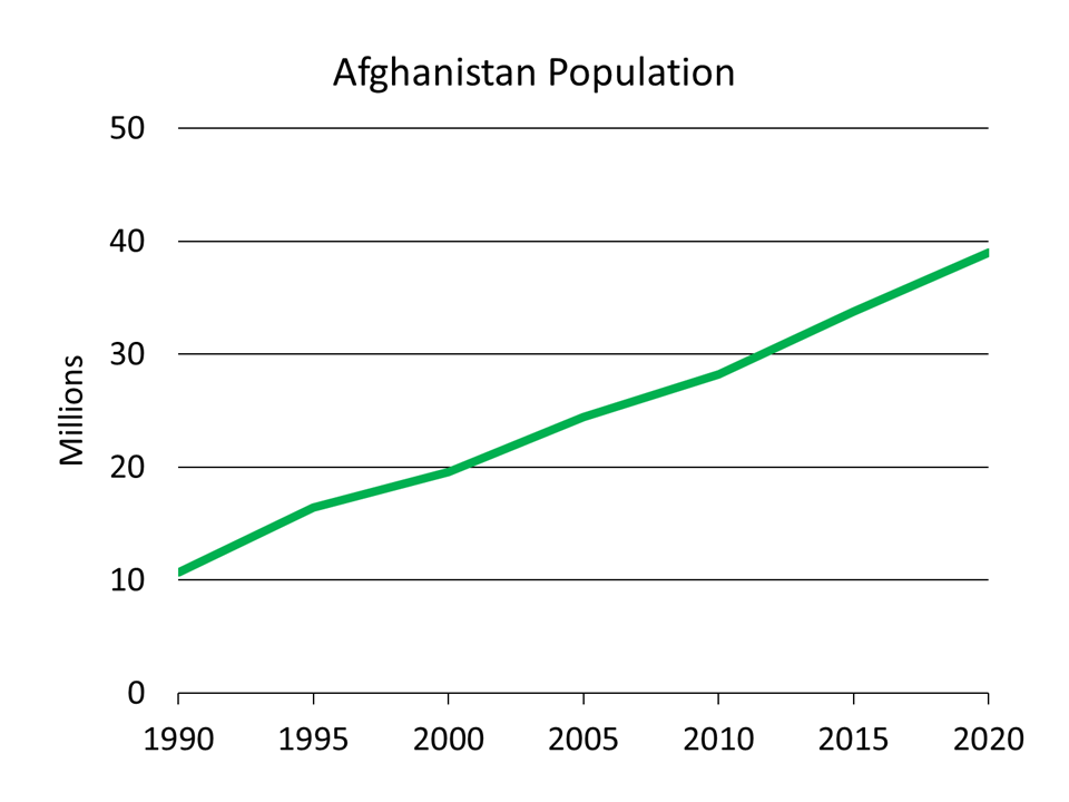 The population of Afghanistan roughly doubled from the beginning of the US invasion in 2001 to the withdrawal in 2021. The fertility rate in Afghanistan was very high at the beginning of that period. It is somewhat lower now, but still well above replacement.