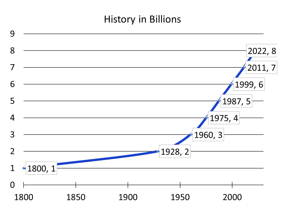In recent history, humans did reproduce to excess. The human population exploded during the last few hundred years, especially during the 20th century. The population explosion was due to modern civilization, which reduced childhood mortality. For most of human history, the population was controlled by war, disease and famine. Modern civilization reduced those causes of premature death. Today, most children live to adulthood, even in developing countries. So, the human population exploded. It is still growing today, by roughly 80 million people per year.